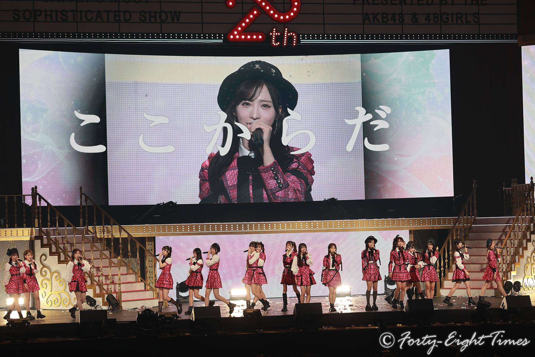 伊藤は「20周年コンサートの期間中、先輩たちは本当に偉⼤で、歴史の重みを感じました。20周年でこんなに素敵な経験をさせていただいて、たくさん盗もうと思って頑張って練習しました。20年間の歴史をたくさん感じて、ここにいらっしゃる(ファンの)皆さんは、私のことを知らない⽅がほとんどだと思うんですけれど、先輩⽅が築いてくださった歴史とともに、私たちAKB48はもっともっと上を⽬指しています︕ 私たちをここで知ってくださった⽅で、AKB48っていいなって思ってくださった皆さん、これから⼀緒についてきてくださったらうれしいです︕」と涙ながらに呼びかけた。