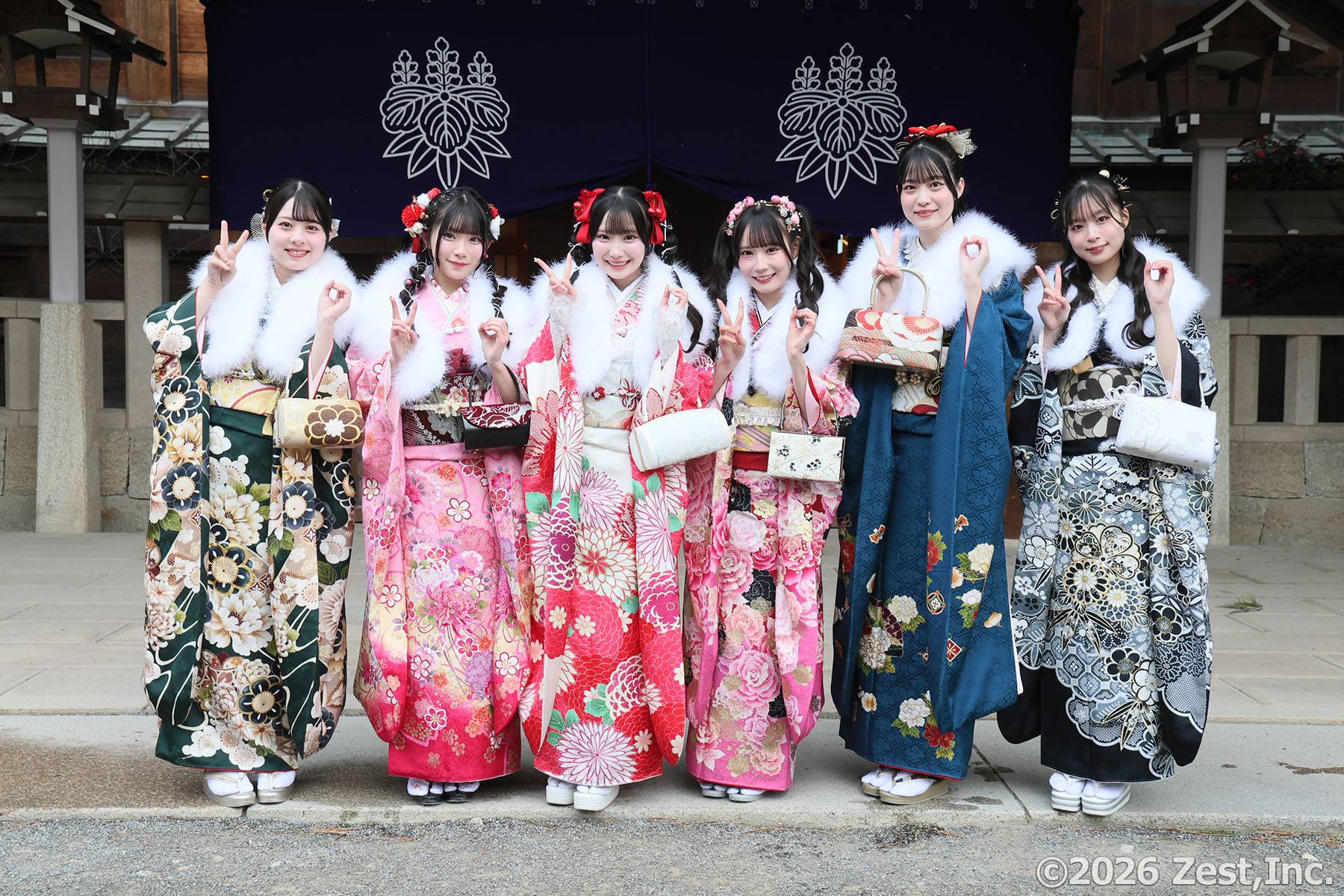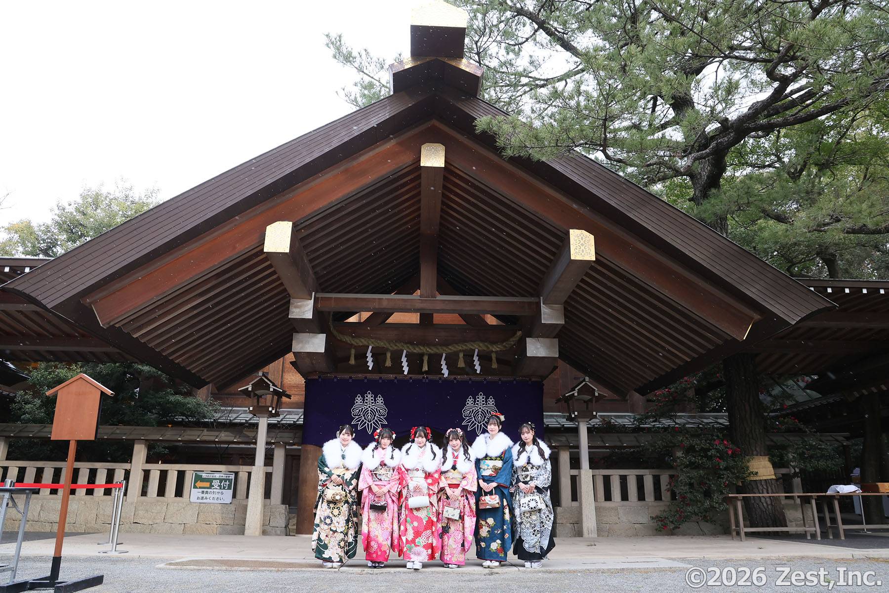 2026年1月12日 成人の日、SKE48の二十歳となる新成人メンバー6名が、愛知県名古屋市・熱田神宮にて「SKE48 二十歳のつどい」に参加いたしました。今年参加した新成人は、8期生~13期生のメンバー6名。昨夜からの雪が残るひんやりとした空気の中、お気に入りを選んだという彩り豊かな振袖に身を包み、厳かな雰囲気の中でご祈祷いただきました。