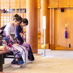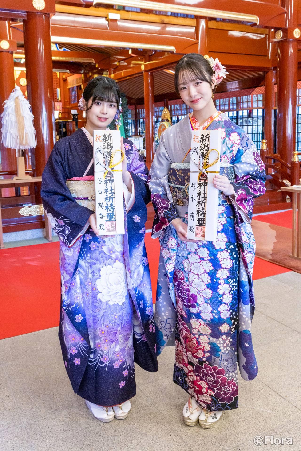 2025年12⽉11⽇(⽊)、新潟を拠点に活動するNGT48の⼆⼗歳となる新成⼈メンバー杉本萌と⾕⼝陽⾹(はるか)の2名が、新潟縣護國神社にて「NGT48⼆⼗歳のつどい」を執り⾏いました。彩り豊かな振袖に⾝を包み、本殿でのご祈祷では神妙な⾯持ちで参列、お祓いや⽟串奉納のあとには⼀⼈ひとり名前の⼊ったお札をもらい、ご祈祷は終了。